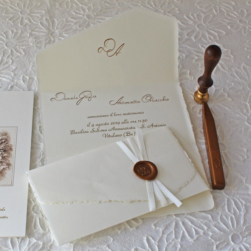 Le partecipazioni in carta d’Amalfi non sono semplici inviti, ma piccoli capolavori di artigianato che racchiudono secoli di storia e nobiltà. Conosciuta anche come “Charta Bambagina“, questa carta si distingue per la sua incredibile morbidezza e per i caratteristici bordi sfrangiati (barbe), ottenuti naturalmente grazie alla lavorazione manuale, senza rifilatura meccanica.