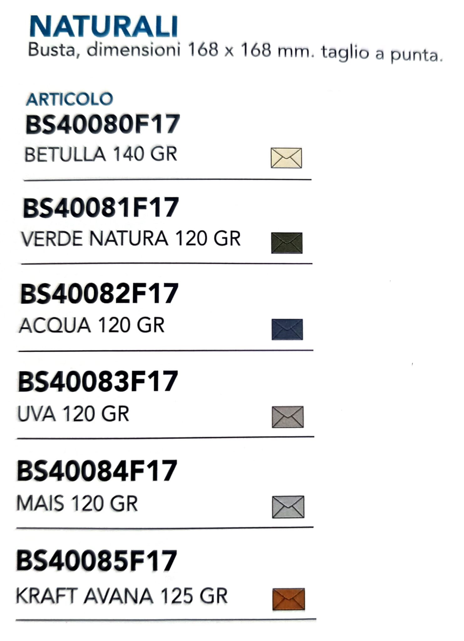 | COLORE | BETULLA Gr 140, VERDE NATURA Gr 120, ACQUA Gr 120, UVA Gr 120, MAIS Gr 120, KRAFT AVANA Gr 120 |