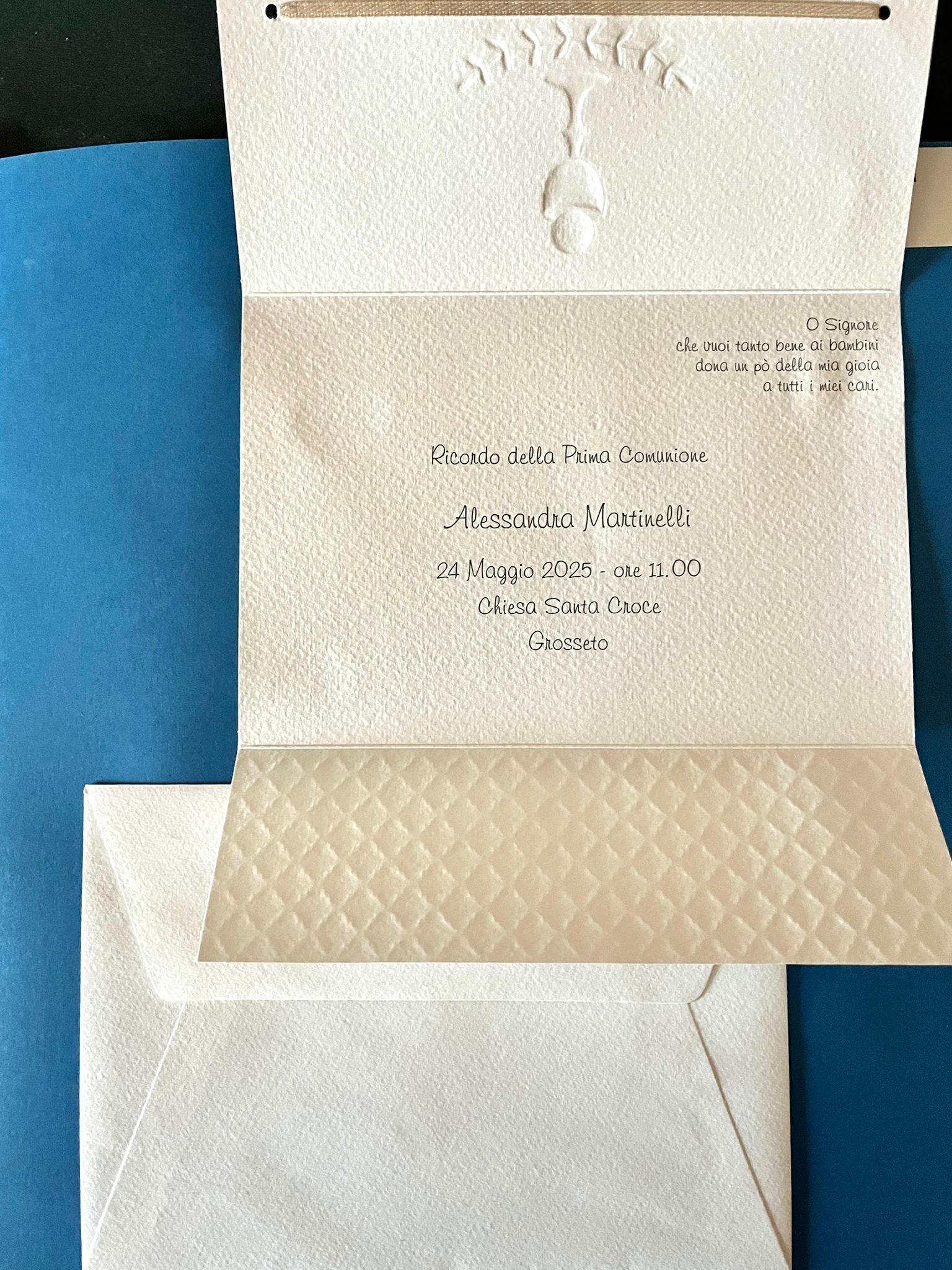 PARTECIPAZIONE COMUNIONE CON APERTURA DALL’ALTO LAVORAZIONE RILIEVO PERLATO CON CALICE COME DA FOTO COMPRENSIVA DI BUSTA F.TO CM 17X11.5
