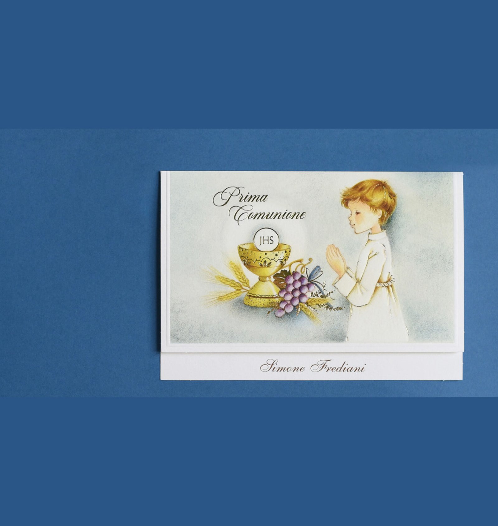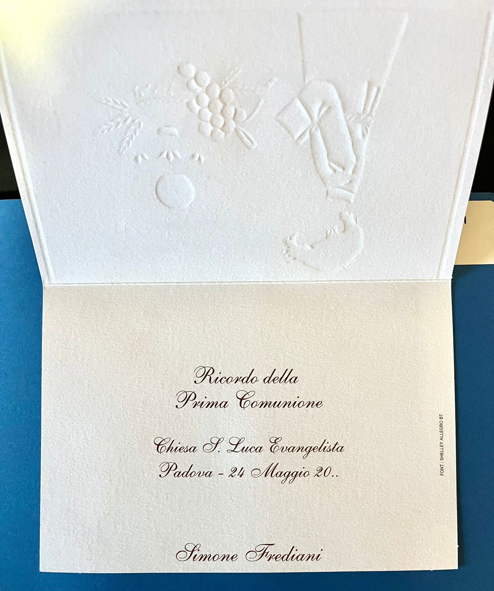 PARTECIPAZIONE COMUNIONE CON LAVORAZIONE RILIEVO A SBALZO E STAMPA ORO COMPRENSIVA DI BUSTA F.TO CM 17X11.5