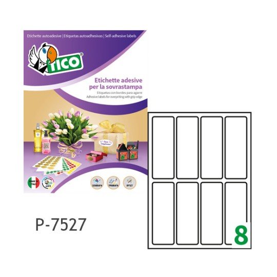 Etichette adesive bianche 75x27mm, 8 etichette per foglio75 x 27 mm, offset, serigrafica, tipografica
