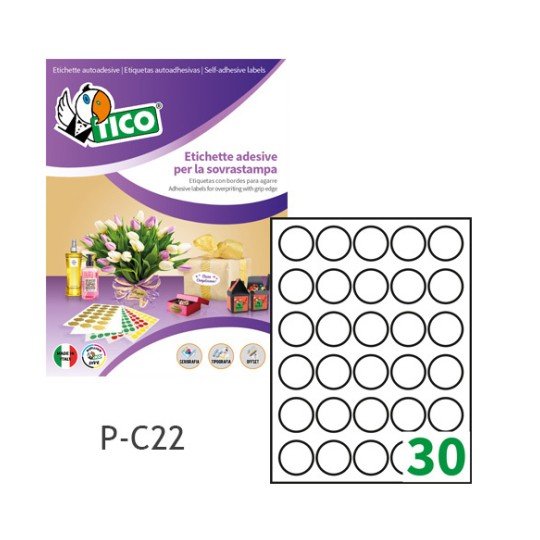 Etichette adesive bianche d. 22mm, 30 etichette per foglioØ 22 mm, offset, serigrafica, tipografica
