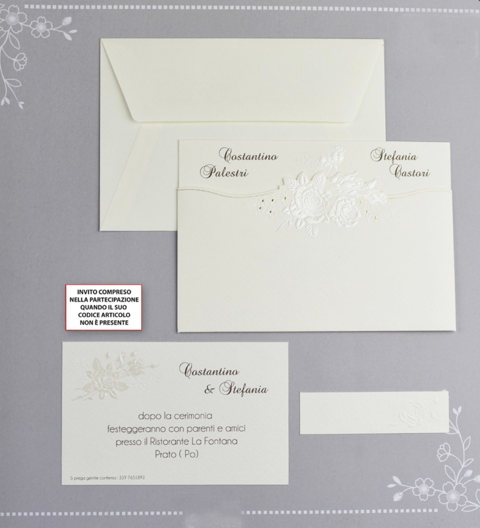 PARTECIPAZIONE NOZZE COMPOSTA DA TASCA CON RILIEVO A SBALZO PERLATO PER CONTENERE ANNUNCIO COMPRESO DI INVITO E BUSTA