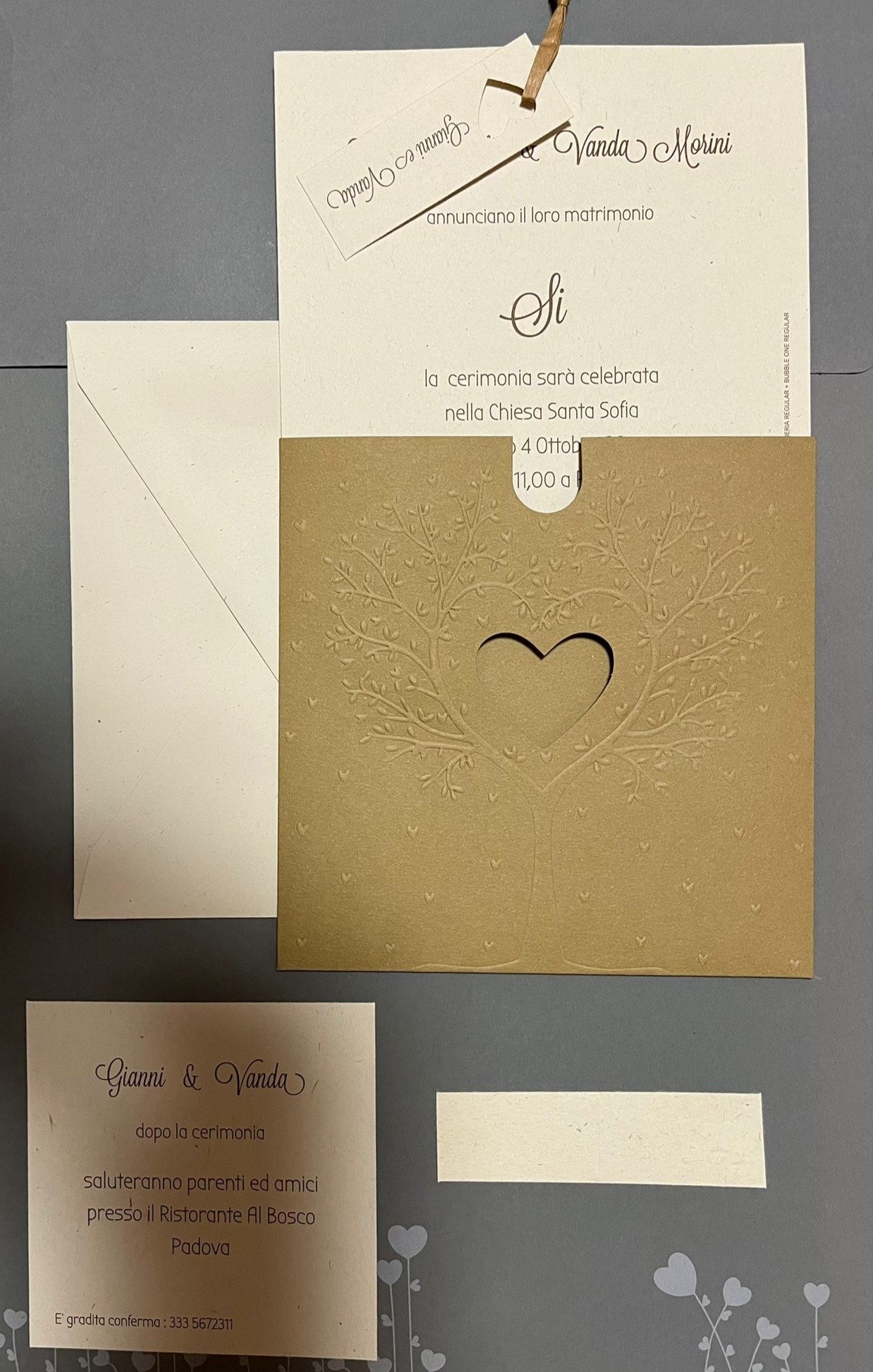 PATECIPAZIONE QUADRATA CON PORTA ANNUNCIO COLOR AVANA CON RILIEVOA SECCO COMPRENSIVA DI BUSTA ED INVITO F.TO MM150X150