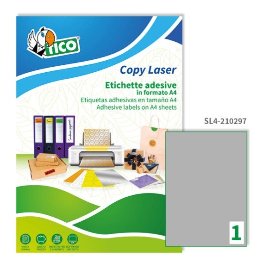 Etichette adesive in carta argento 210x297mm, 1 etichetta per foglio210 x 297 mm, Laser, offset, serigrafica, tipografica, permanente. Confezione